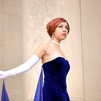 Anastasia's blue dress was made in a luxurious velvet, and lined with a textured "Simply Silky" satin. It has an invisible zipper in the center back. The capes are five yards of costume chiffon, bedazzled with hundreds of hand applied Swarovskies. The capes button onto the dress at the back, and also have loops at the end that I can attach to my gloves when I am traveling.